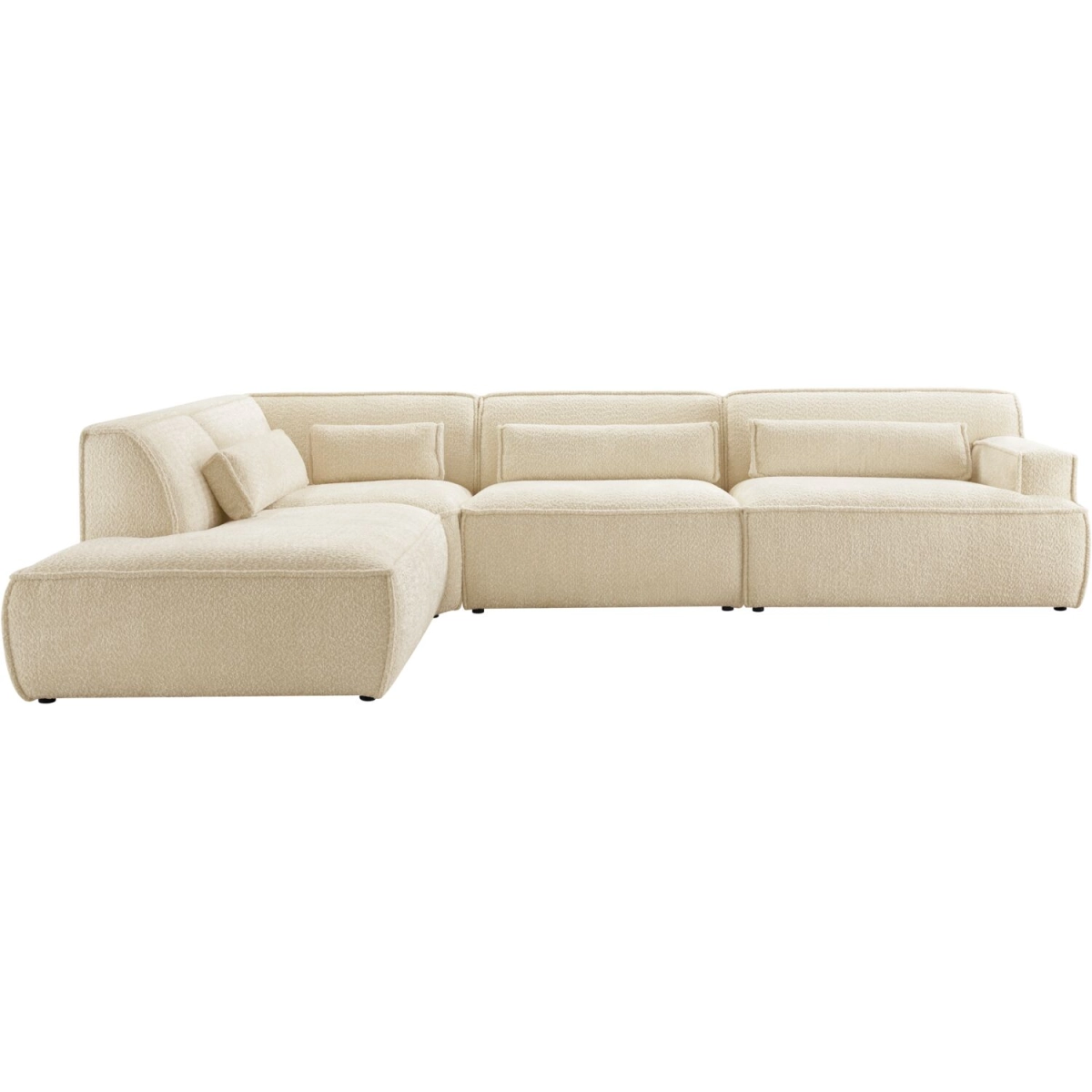 Hoek met eiland links + 1,5 zits (100) zonder armen + 1,5 zits (100) arm rechts, uitgevoerd in stof venga 102-ecru met kunststof zwarte pootjes (hoogte 3 cm), inclusief 2 lendekussens 90 cm en 1 lendekussen 55 cm in stof venga 102-ecru.
