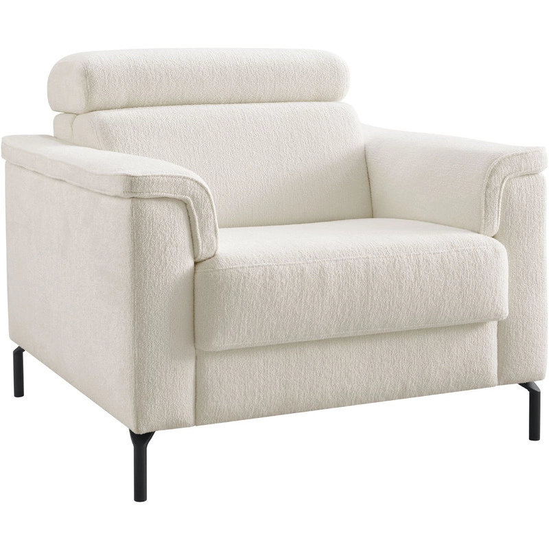 Uitgevoerd in stof sino 101-ivory met arm type O, diepe zit (56 cm), verstelbare hoofdsteun, memory foam i.c.m. HR-schuim in de zitting en zwarte metalen poten type MF9 (14 cm).