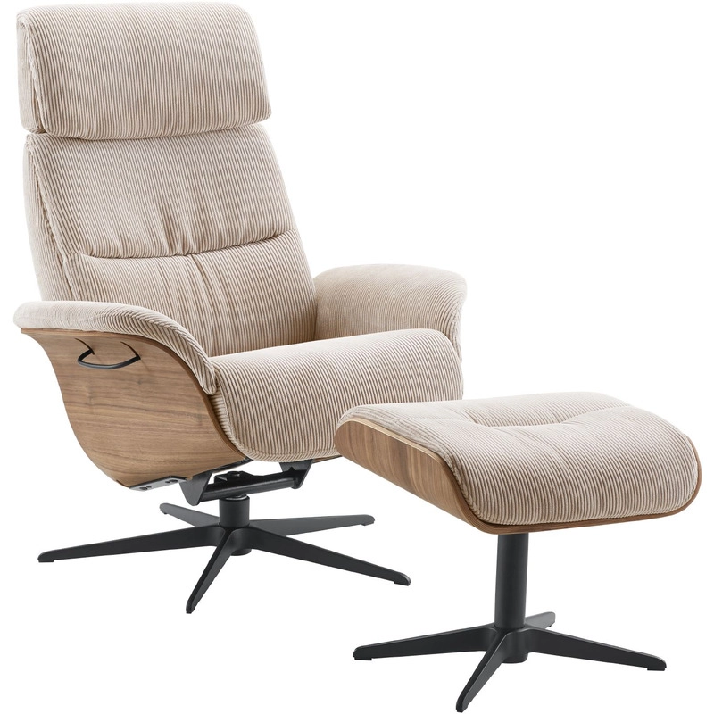 Deze hocker is uitgevoerd in een beige stof met sierstiksel, een noten geoliede schaal en met een zwart metalen 5-teensvoet, wat de hocker een elegante uitstraling geeft. De hocker hoort bij draaifauteuil Hintas, en geeft zo extra comfort.