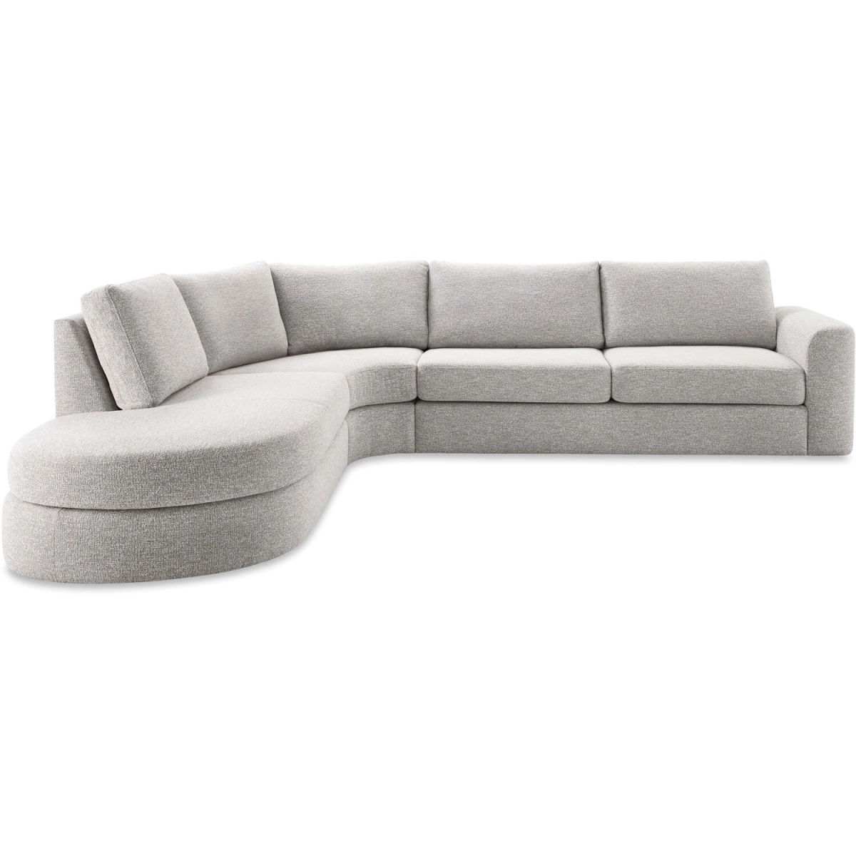 1 zits met eiland rond links + ronde hoek + 3 zits arm rechts, uitgevoerd in stof lodge 40-ashgrey met zwarte kunststof pootjes (hoogte 2,5 cm).