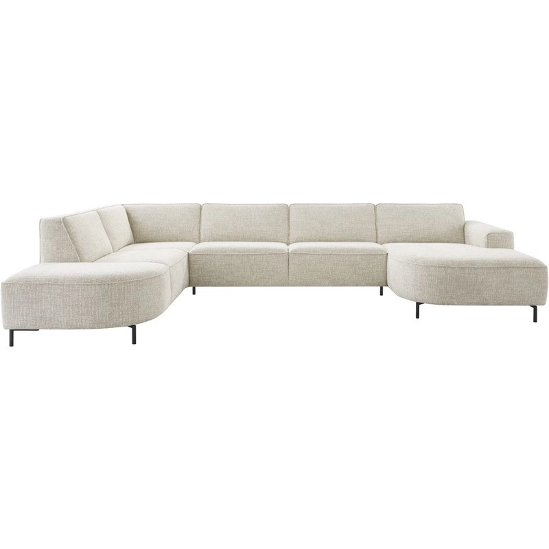 Hoek met eiland rond links + 2,5 zits zonder armen + longchair rond arm rechts uitgevoerd in stof coco 196-shell met arm type A, Engelse stiknaad en zwarte metalen poten, type MF5 (13 cm).