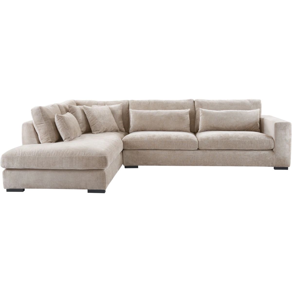 Hoek met eiland links + 2,5 zits arm rechts uitgevoerd in stof harmony 04-taupe met zwarte houten poten, incl. 3 bijpassende sierkussens.