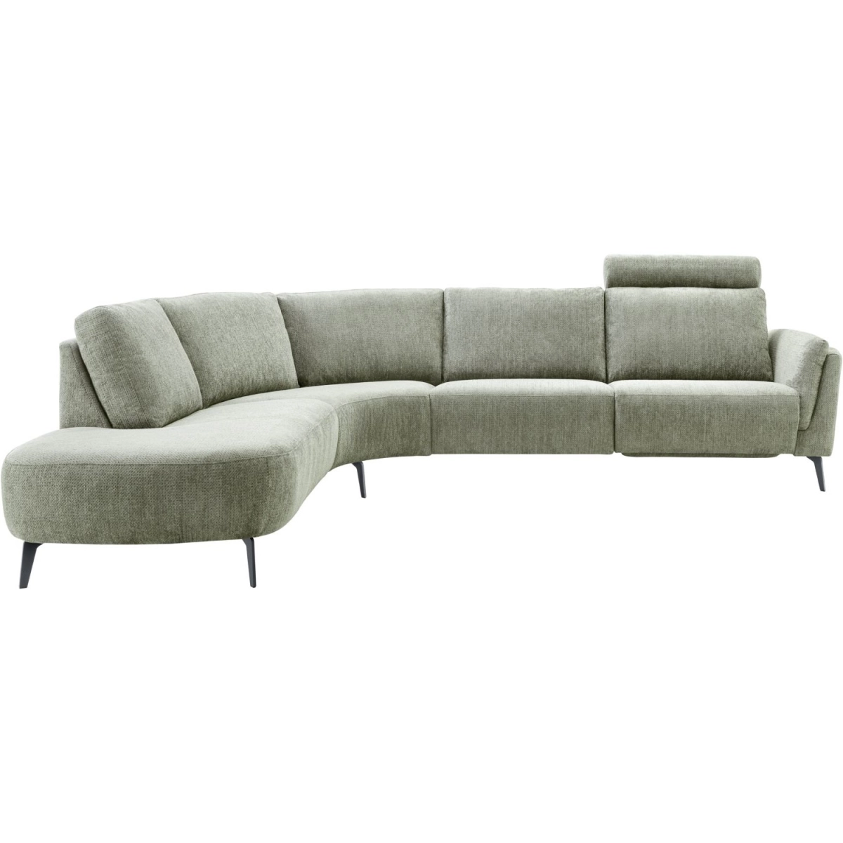 1 zits met eiland rond links + ronde hoek + 1,5 zits (80) zonder armen + 1,5 zits (80) arm rechts met elektrische relaxfunctie en hoofdsteun NF80, uitgevoerd in stof fusion 206-thyme met zwart metalen poten type 2H4K (hoogte 16 cm).