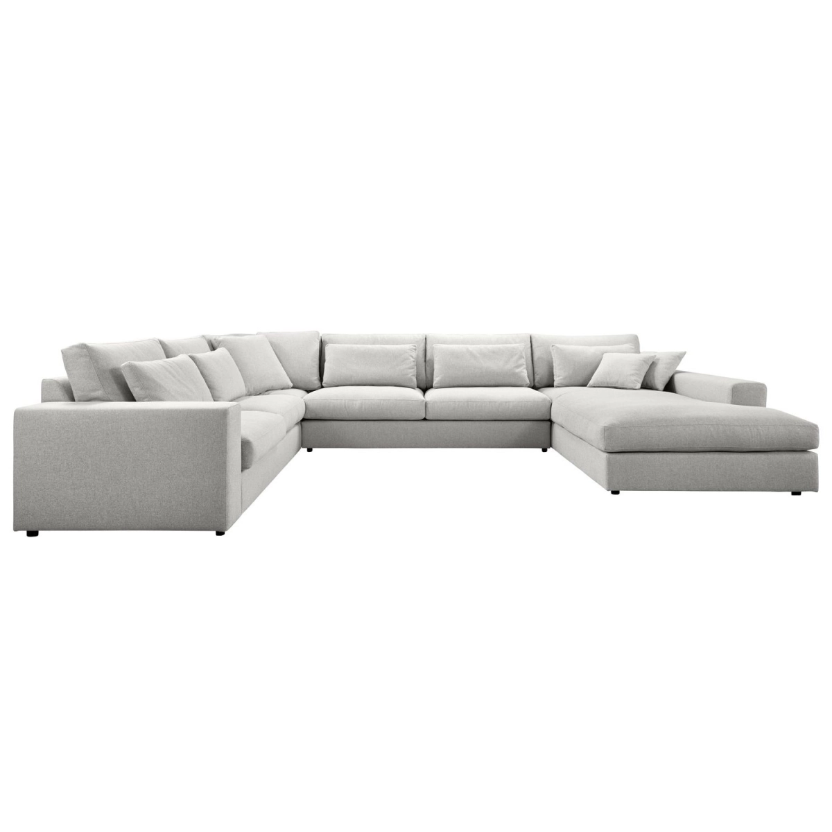 2,5 zits arm links + hoekelement + 3 zits zonder arm + longchair XL 95 arm rechts uitgevoerd in stof unit 60-light grey met zwarte kunststof poten, inclusief luxe 9-delige (lende)kussenset.