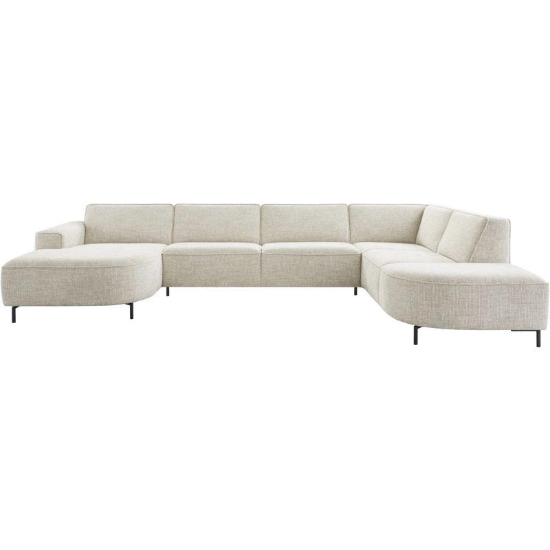 Longchair rond arm links + 2,5 zits zonder armen + hoek met eiland rond rechts uitgevoerd in stof coco 196-shell met arm type A, Engelse stiknaad, memory foam i.c.m. HR-schuim in de zitting en zwarte metalen poten, type MF5 (13 cm).