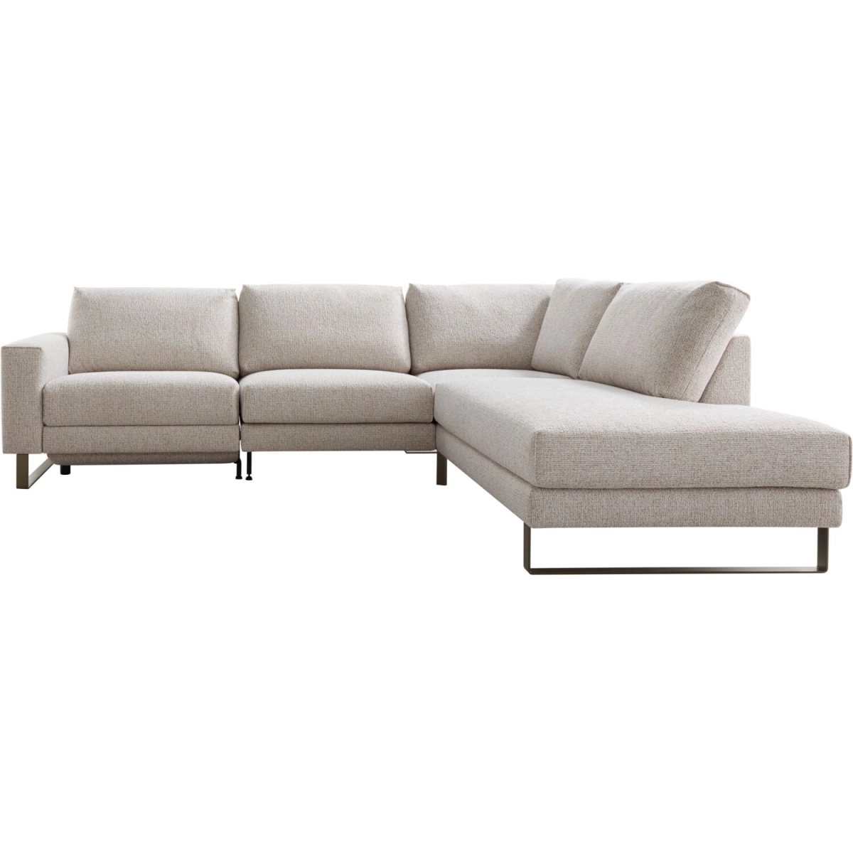 1 zits 80 arm links met elektrische relaxfunctie en verstelbare hoofdsteun 60 cm + 1 zits 80 zonder armen + hoek met eiland rechts in stof taurus 01-naturel met bonellvering met een toplaag van HR-koudschuim in de zitting, een mix van polyetherschuim- en