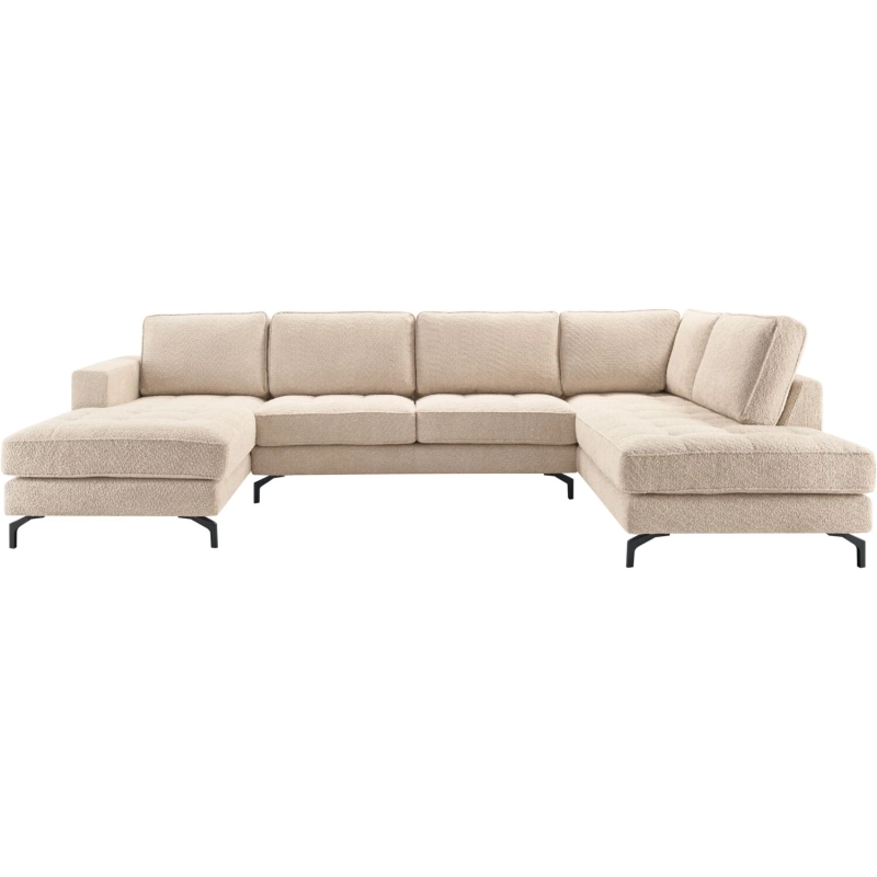 Longchair arm links + 2,5 zits zonder armen + hoek met eiland groot rechts uitgevoerd in stof arena 02-beige met zitkussens met vierkant stiksel en zwarte metalen poten.