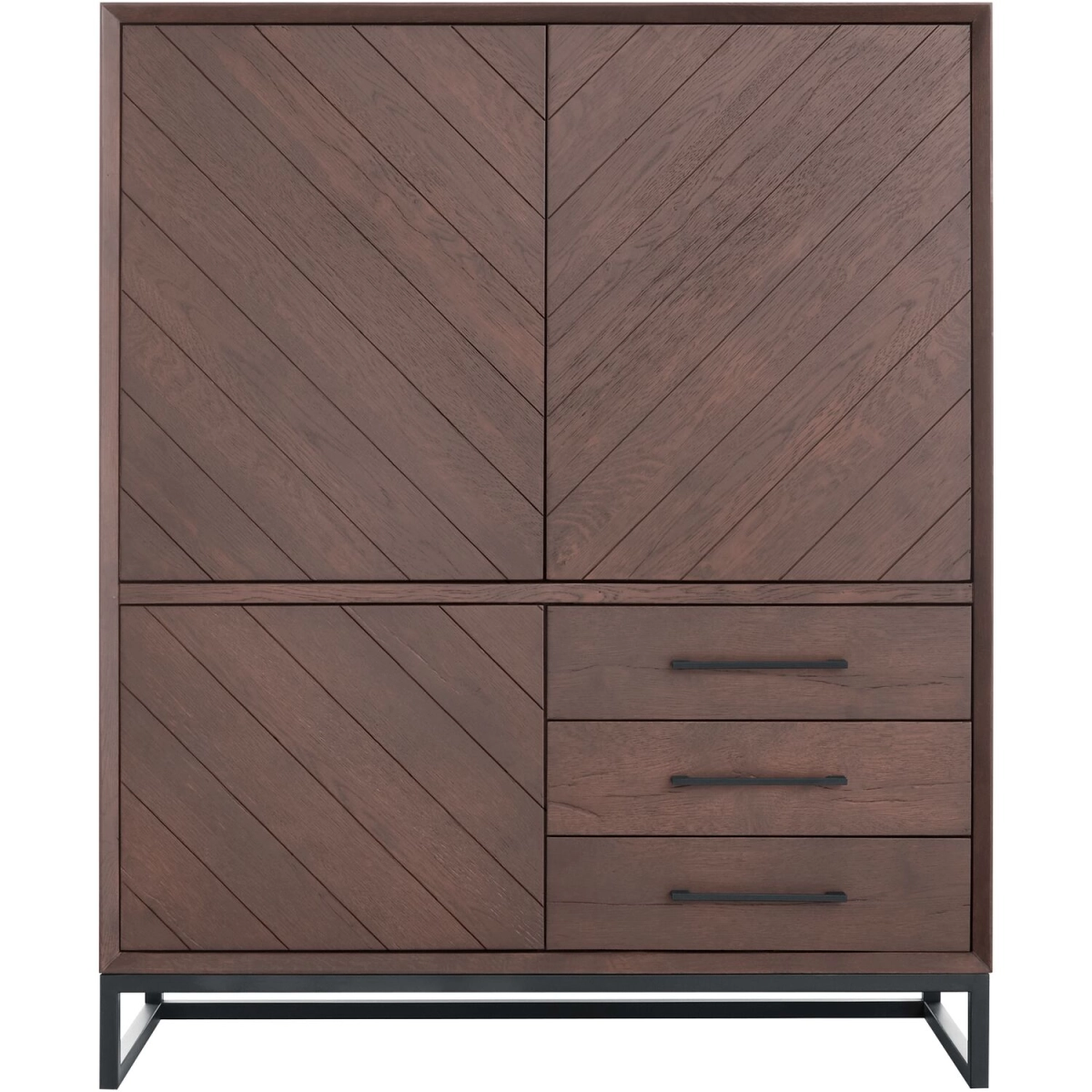 Je kunt kiezen uit verschillende kleuren. Deze opbergkast heeft drie deuren en drie laden en is uitgevoerd met een laklaag in de kleur Coffee.