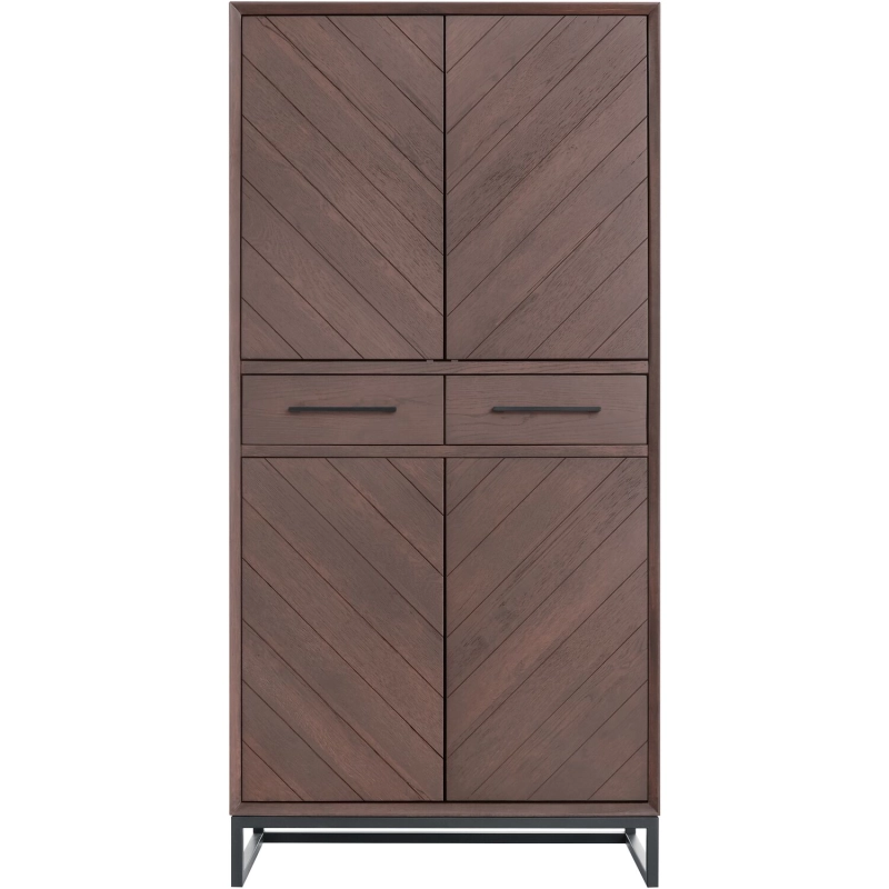 Je kunt kiezen uit verschillende kleuren. Deze opbergkast heeft vier deuren en twee laden en is uitgevoerd met een laklaag in de kleur Coffee.