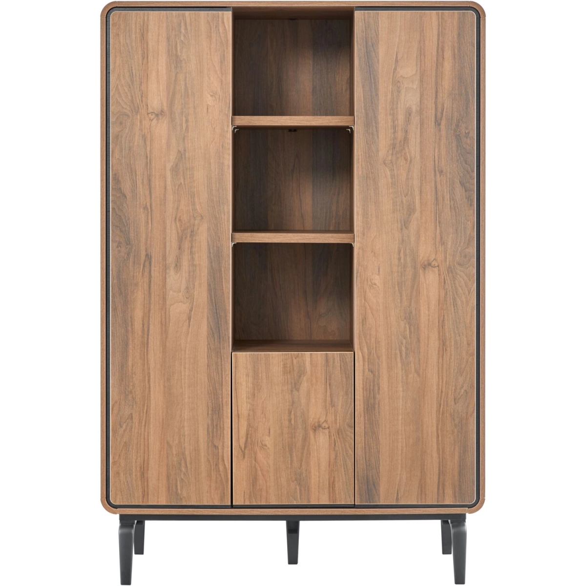 Opbergkast Lagoria is onderdeel van een woonprogramma en heeft een strakke en moderne uitstraling. Deze opbergkast is voorzien van 3 deurtjes, 3 open vakken incl. verlichting en zwarte metalen poten. De prachtige afgeronde vormgeving en het subtiele zwarte randje rondom de deurtjes springen direct in het oog. Dankzij de Melamine afwerking in Brushed walnut nature heeft Lagoria de uitstraling van echt hout, maar is zeer kras-, slijt- en stootvast en makkelijk in onderhoud.