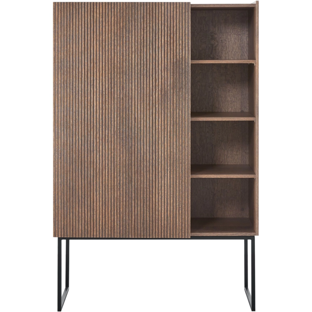 Opbergkast Marandi is onderdeel van een stoer en tijdloos woonprogramma. Deze handige opbergkast is uitgevoerd in bruin eiken fineer en voorzien van 1 grote deur en 4 open vakken. De zwart metalen poten in combinatie met de mooie geribbelde structuur geven model Marandi een licht industriële look. De deur van de kast is voorzien van een push-to-open en soft-close systeem.