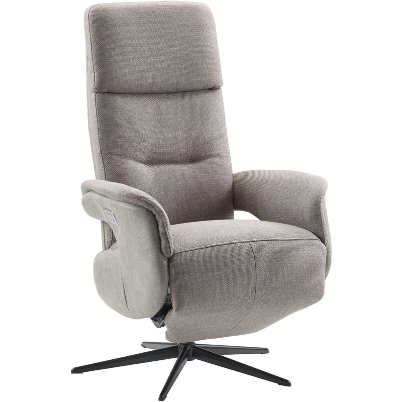 LARGE uitvoering, uitgevoerd in stof bjorn 9951-grey (voorkant) en microleder texbull 2898-grey (achterkant) met verstelbare rugleuning en voetensteun d.m.v. 2-motoren, verstelbare hoofdsteun, gestoffeerde open arm en zwarte metalen 5-teensvoet (voet A, m