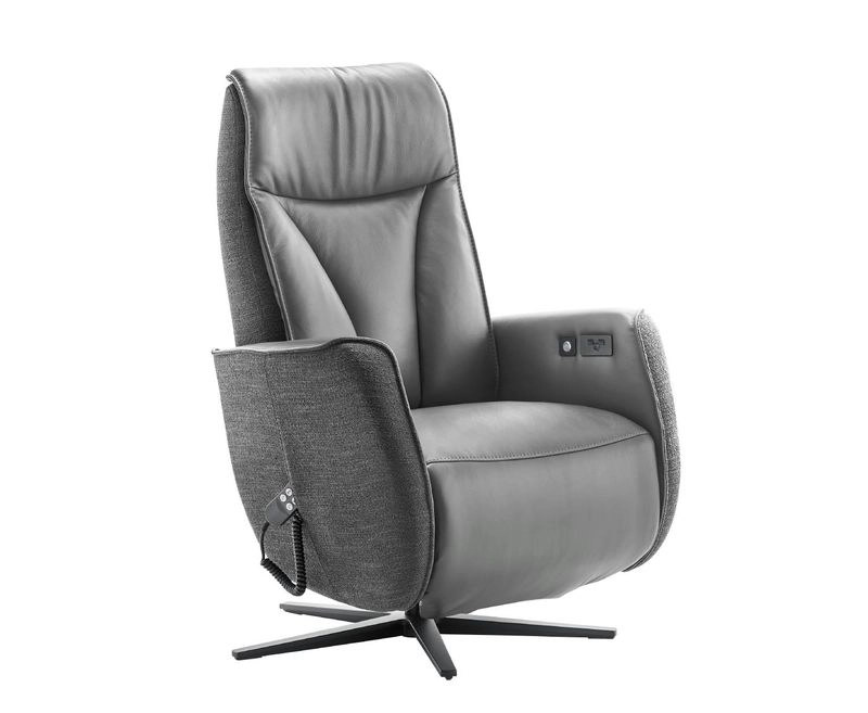 Medium uitvoering, uitgevoerd in leder lucca antraciet met achterkant en zijkant in stof leaf 165-lava (variant 10) met V-patroonstiksel in de rug (type C), armleuning type 3, elektrisch verstelbaar d.m.v 2 motoren incl. sta-op functie, elektrisch verstel