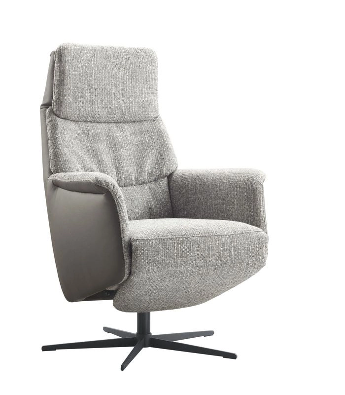 Large uitvoering in stof chrono 167-zinc met achterkant in leder toledo antraciet, elektrisch verstelbare rugleuning en voetensteun d.m.v. 2 motoren en zwarte metalen kruisvoet KMF3.