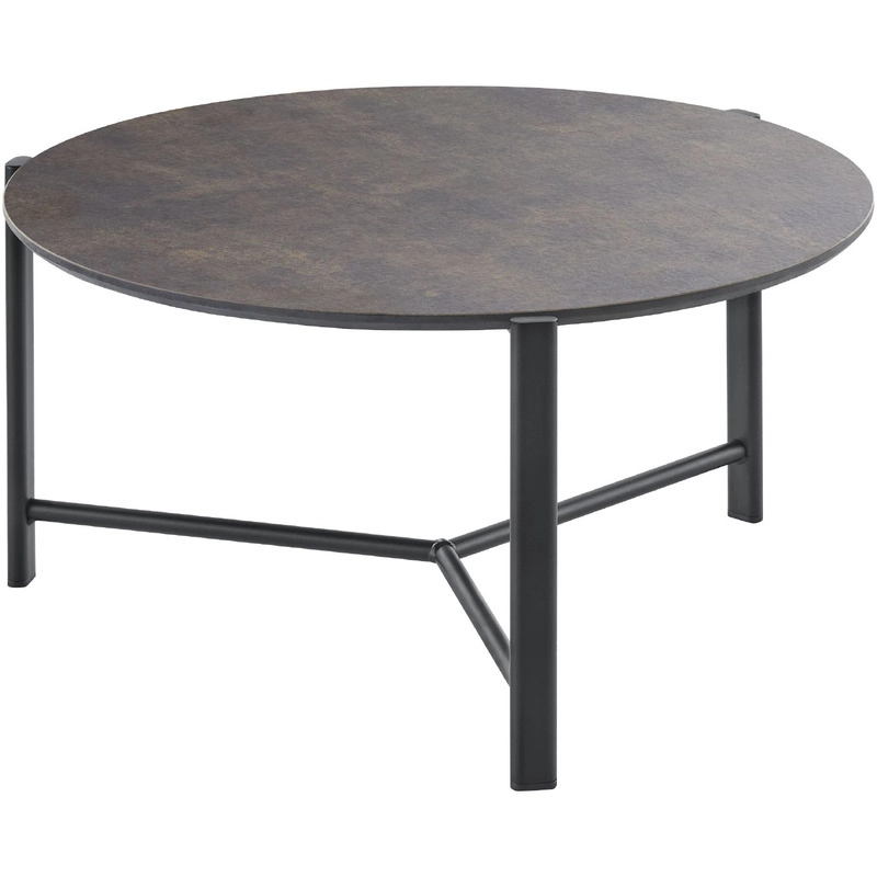 Uitgevoerd met een rond kunststof HPL bovenblad in de kleur italian stone met verjongde zwarte bladrand en een zwart metalen frame.