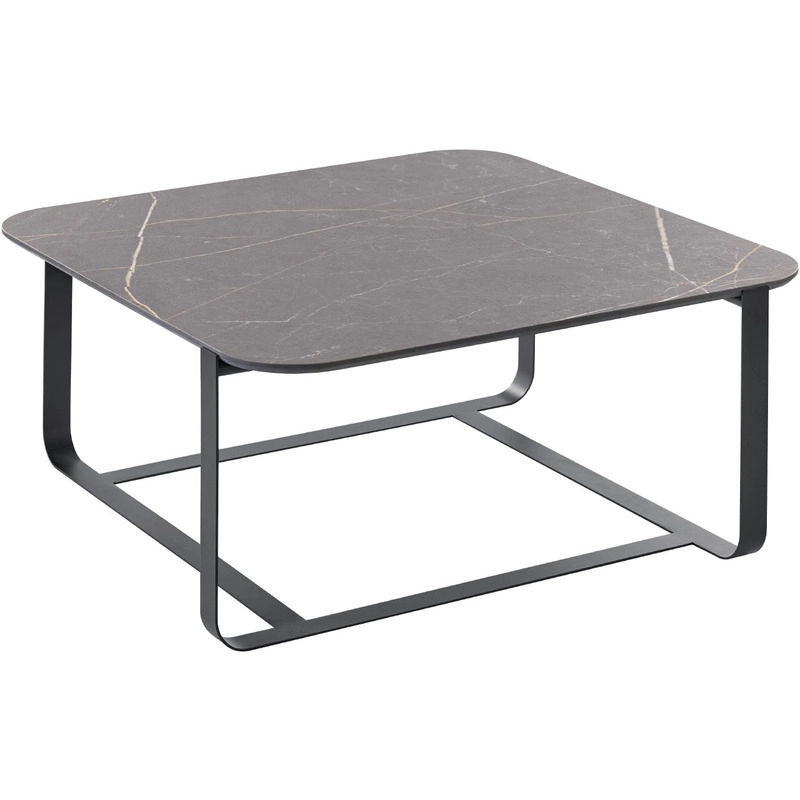 Uitgevoerd met een vierkant kunststof HPL bovenblad in de kleur arpa urban 3482 geaderd met verjongde zwarte bladrand en een zwart metalen frame.
