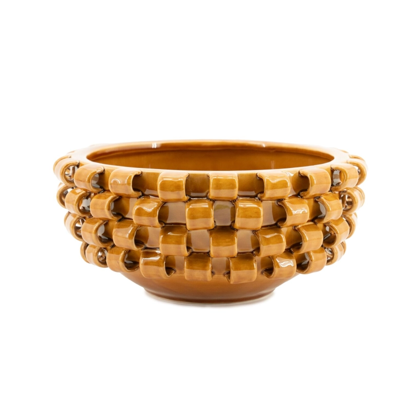 Geglazuurd aardewerk uitgevoerd in de kleur mustard. Handgemaakt. Kleurverschillen en onregelmatigheden in de glazuring maken deel uit van het fabricageproces