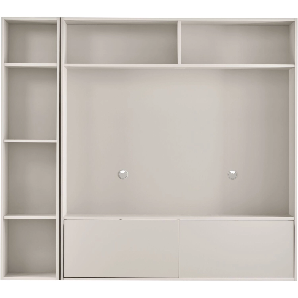 Uitgevoerd in melamine pebble grey met 2 kleppen en 7 open vakken.