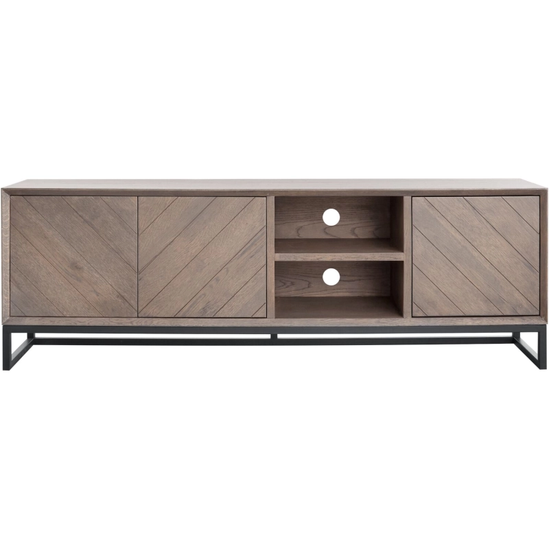 Je kunt kiezen uit verschillende kleuren. Dit TV-Meubel heeft drie deuren en twee open vakken en is uitgevoerd met een laklaag in de kleur Slate.