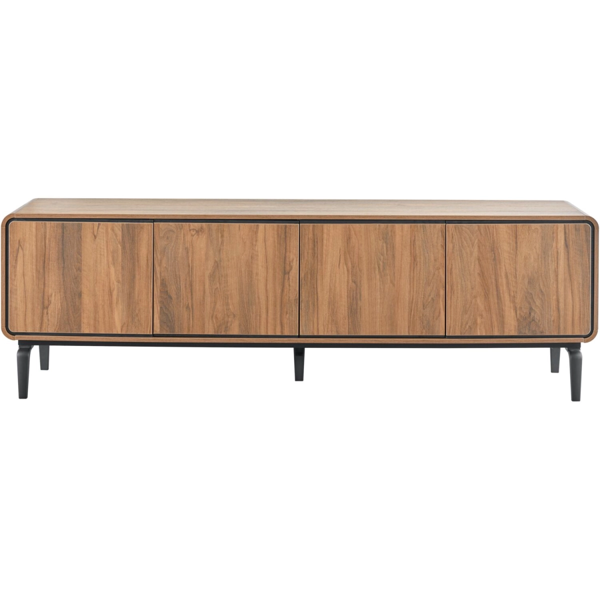TV-meubel Lagoria is onderdeel van een woonprogramma en heeft een strakke en moderne uitstraling. Dit TV-meubel is voorzien van 4 deurtjes en zwarte metalen poten. De prachtige afgeronde vormgeving en het subtiele zwarte randje rondom de deurtjes springen direct in het oog. Dankzij de Melamine afwerking in Brushed walnut nature heeft Lagoria de uitstraling van echt hout, maar is zeer kras-, slijt- en stootvast en makkelijk in onderhoud.