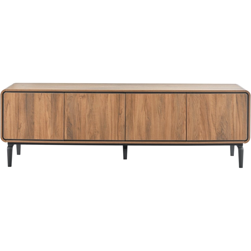 Uitgevoerd in melamine in kleur brushed walnut nature met 4 deuren en zwarte metalen poten.