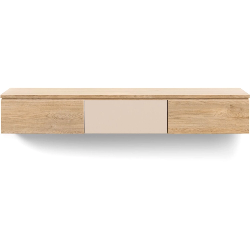 Dit TV-meubel bestaat uit drie lage modules, waarvan twee met kleppen en een bovenblad in de kleur Old Oak en een lade in de kleur Ivory gelakt.