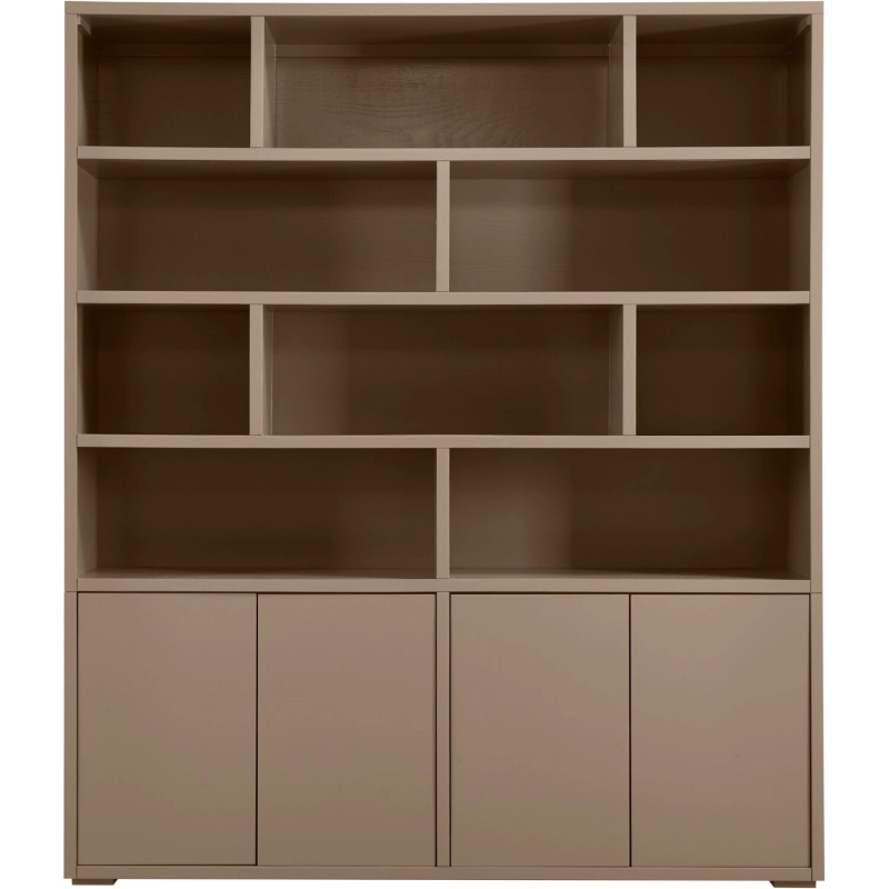 De kastenserie van Nerano is strak en tijdloos. Deze wandkast is uitgevoerd in eiken fineer in de kleur schors en heeft 4 deuren en 10 open vakken. De eiken ombouw is gelakt, waardoor deze vriendelijk in onderhoud is.