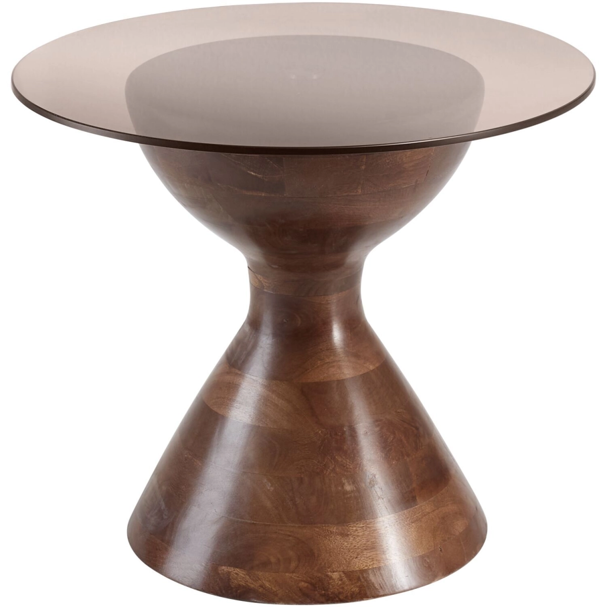 Bijzettafel Ø57 cm AboniBlad in smoked glasOnderstel in mango houtHandige bijzettafel die makkelijk te verplaatsen en overal inzetbaar is. Uitgevoerd met een smoked glas bovenblad en een massief mango houten onderstel in kleur bruin walnoot. Ook leverbaar als salontafel met afmeting Ø78 cm. Combineer de verschillende tafeltjes voor een leuk geheel.Voor het dagelijks onderhoud kun je het meubel eenvoudig afnemen met een licht vochtige doek, nadien goed droogwrijven. Vocht kan blijvende vlekken achterlaten. Gebruik daarom altijd onderzetters om het hout te beschermen. Gebruik geen agressieve schoonmaakmiddelen.