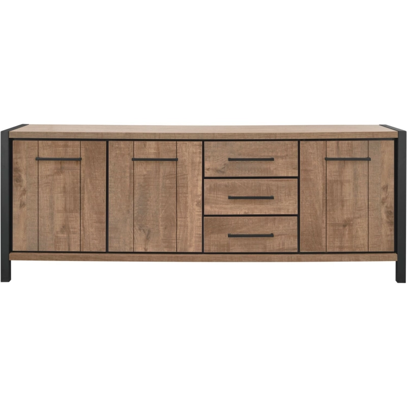 Uitgevoerd in de kleur dark mango met zwart metalen frame, 3 deuren en 3 laden.