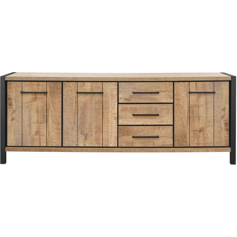 Uitgevoerd in de kleur mango met zwart metalen frame, 3 deuren en 3 laden.
