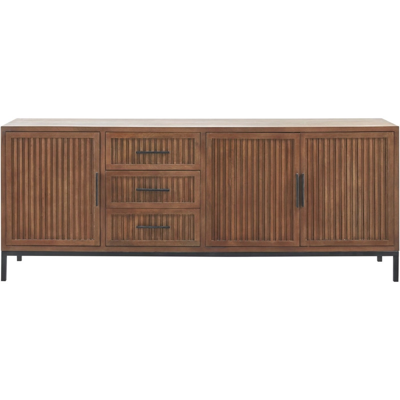 Trendy dressoir 198 cm breed Gemaakt van duurzaam mangohout 3 deuren en 3 lades Zwart metalen frame Voorgemonteerd Onderdeel van een meubelserie Maverna is een trendy woonprogramma, gemaakt van duurzaam mangohout. Het hout is afgewerkt met een chique bruine lak. Daarnaast geeft de combinatie met zwart metaal een moderne look aan de meubels. Dressoir Maverna is voorzien van trendy lamellen bij de deuren en laden.Het dressoir beschikt over 3 deuren en 3 lades. Achter de deuren zit een vaste legplank, waardoor je makkelijk spullen kunt opbergen.¿ Bovenop het meubel kun je leuke woonaccessoires zetten om er een echte eyecatcher van te maken. Dressoir Maverna is voorgemonteerd, waardoor je hem gelijk een leuk plekje kunt geven.Dressoir Maverna is onderdeel van een woonserie, waardoor je hem goed kunt combineren met een bijpassende boekenkast, opbergkast, TV-meubel en een eettafel. Wanneer je meerdere meubels met elkaar combineert wordt je interieur een mooi geheel.OnderhoudsadviesVoor het dagelijks onderhoud kun je het meubel gewoon afnemen met een lichtvochtige doek en direct nadrogen met een droge doek. Voor een intensieve reiniging kun je Natural Wood Cleaner gebruiken. Dit is een intensieve houtreiniger die tevens als voorbehandelingsmiddel fungeert bij het gebruik van onderhoudsmiddelen.