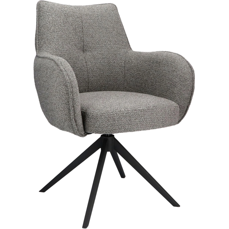 Heerlijk comfortabele armstoel Derio in grijze stof Draaibare eetkamerstoel met stevige armleuningen Luxe grijze weefstof Te belasten tot 120 kg In diverse kleuren verkrijgbaar Stijlvolle uitstralingArmstoel Derio ziet er heerlijk comfortabel uit! Dit nodigt uit om heerlijk te gaan zitten. De grijze weefstof is heerlijk zacht, dit nodigt uit om lekker te gaan zitten. Het zwarte onderstel met smalle poten geeft de stoel een verfijnd uiterlijk. De intrekking in de rugleuning maakt de stoel helemaal af.Slim designMet de draaifunctie van de stoel Derio is comfortabel aanschuiven en opstaan een fluitje van een cent. De stevige armleuningen bieden extra ondersteuning en dragen bij aan een ontspannen zitervaring. De zit van de stoel is comfortabel en niet te hard.Praktische infoDe armleuninghoogte van de stoel Derio is 66 cm, waardoor deze gemakkelijk onder de meeste standaard eettafels past. De poot moet nog onder de zitting gemonteerd worden, maar met de bijgeleverde handleiding is dit snel en eenvoudig te realiseren. Zo kun je direct genieten van deze stijlvolle toevoeging aan je eetkamer.In 3 kleuren leverbaarDe stoel Derio is verkrijgbaar in drie prachtige kleuren: beige, taupe en grijs. Kies voor een uniforme look of combineer verschillende kleuren rond de tafel voor een speels en dynamisch effect.OnderhoudsadviesVoor het onderhoud van deze stoel adviseren we de Textile & Leather protector. Dit beschermt tegen vlekken op basis van water, vet of olie. Na behandeling kunnen vloeistoffen eenvoudig met een goed absorberende tissue worden opgedept.