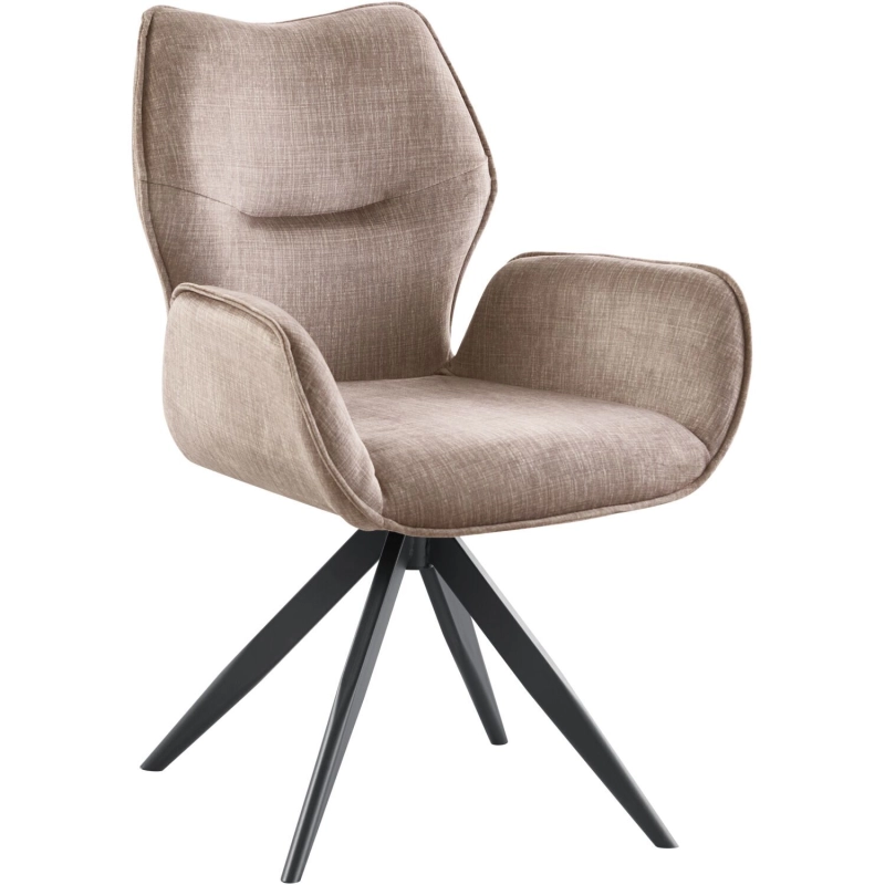 Armstoel Oviedio in bruin met zwarte draaipoot Bruine stof met lichte glans In 3 kleuren leverbaar Te belasten tot 120 kg Ook verkrijgbaar zonder armleuning Tijdloos designArmstoel Oviedio is bekleed met een hoogwaardige bruine stof, die door zijn fijne structuur en lichte glans een luxe uitstraling geeft. De rugleuning is voorzien van een fraai sierstiksel. Het metalen onderstel in mat zwart versterkt het moderne karakter en zorgt voor een stevige basis. De combinatie van de bruine bekleding met het zwarte frame maakt deze stoel een eyecatcher in elk interieur. De opening tussen de rug- en armleuning geeft de stoel een luchtige uitstraling.Comfort & gebruiksgemakOviedio biedt een uitstekend zitcomfort dankzij de kuipvorm. Deze sluit mooi aan op het lichaam, wat bijdraagt aan een stevige ergonomische zitervaring. Dankzij de draaifunctie is de stoel gemakkelijk te gebruiken, ideaal voor aan de eettafel of een werkplek. Of je nu lang aan tafel zit of comfortabel wilt werken, de Oviedio maakt het mogelijk.Praktische infoDe armleuning van de stoel heeft een hoogte van 63 cm, waardoor deze perfect onder een standaard eettafel past. Montage is eenvoudig, en een duidelijke handleiding wordt meegeleverd. Binnen enkele minuten staat de stoel stevig en klaar voor gebruik.In 3 kleuren beschikbaarArmstoel Oviedio is verkrijgbaar in drie verschillende kleuren: beige, bruin en antraciet, en is tevens verkrijgbaar zonder armleuning. Tip: combineer verschillende kleuren voor een speels effect aan de eettafel.OnderhoudsadviesVoor het onderhoud van deze stoel adviseren we de Textile & Leather protector. Dit beschermt tegen vlekken op basis van water, vet of olie. Na behandeling kunnen vloeistoffen eenvoudig met een goed absorberende tissue worden opgedept.