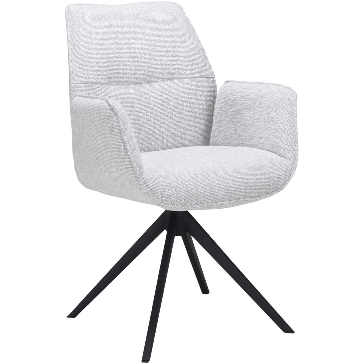 Armstoel Otero met armleuning in lichtgrijze stof Draaibare eetkamerstoel met stevige armleuningen Luxe lichtgrijze weefstof Te belasten tot 120 kg In diverse kleuren verkrijgbaar Stijlvolle uitstralingDe stoel Otero straalt pure elegantie uit dankzij zijn bekleding in een luxe lichtgrijze weefstof met een grove structuur. Het zwarte onderstel met smalle poten geeft de stoel een verfijnd uiterlijk, en de spleet tussen de arm- en rugleuning geeft de stoel een luchtig effect. Het stierstiksel in de rugleuning maakt de stoel helemaal af.Slim designMet de draaifunctie van de stoel Otero is comfortabel aanschuiven en opstaan een fluitje van een cent. De stevige armleuningen bieden extra ondersteuning en dragen bij aan een ontspannen zitervaring.Praktische infoDe armleuninghoogte van de stoel Otero is 67,5 cm, waardoor deze gemakkelijk onder de meeste standaard eettafels past. De poot moet nog onder de zitting gemonteerd worden, maar met de bijgeleverde handleiding is dit snel en eenvoudig te realiseren. Zo kun je direct genieten van deze stijlvolle toevoeging aan je eetkamer.In 3 kleuren leverbaarDe stoel Otero is verkrijgbaar in drie prachtige kleuren: beige, lichtgrijs en taupe. Kies voor een uniforme look of combineer verschillende kleuren rond de tafel voor een speels en dynamisch effect.OnderhoudsadviesVoor het onderhoud van deze stoel adviseren we de Textile & Leather protector. Dit beschermt tegen vlekken op basis van water, vet of olie. Na behandeling kunnen vloeistoffen eenvoudig met een goed absorberende tissue worden opgedept.