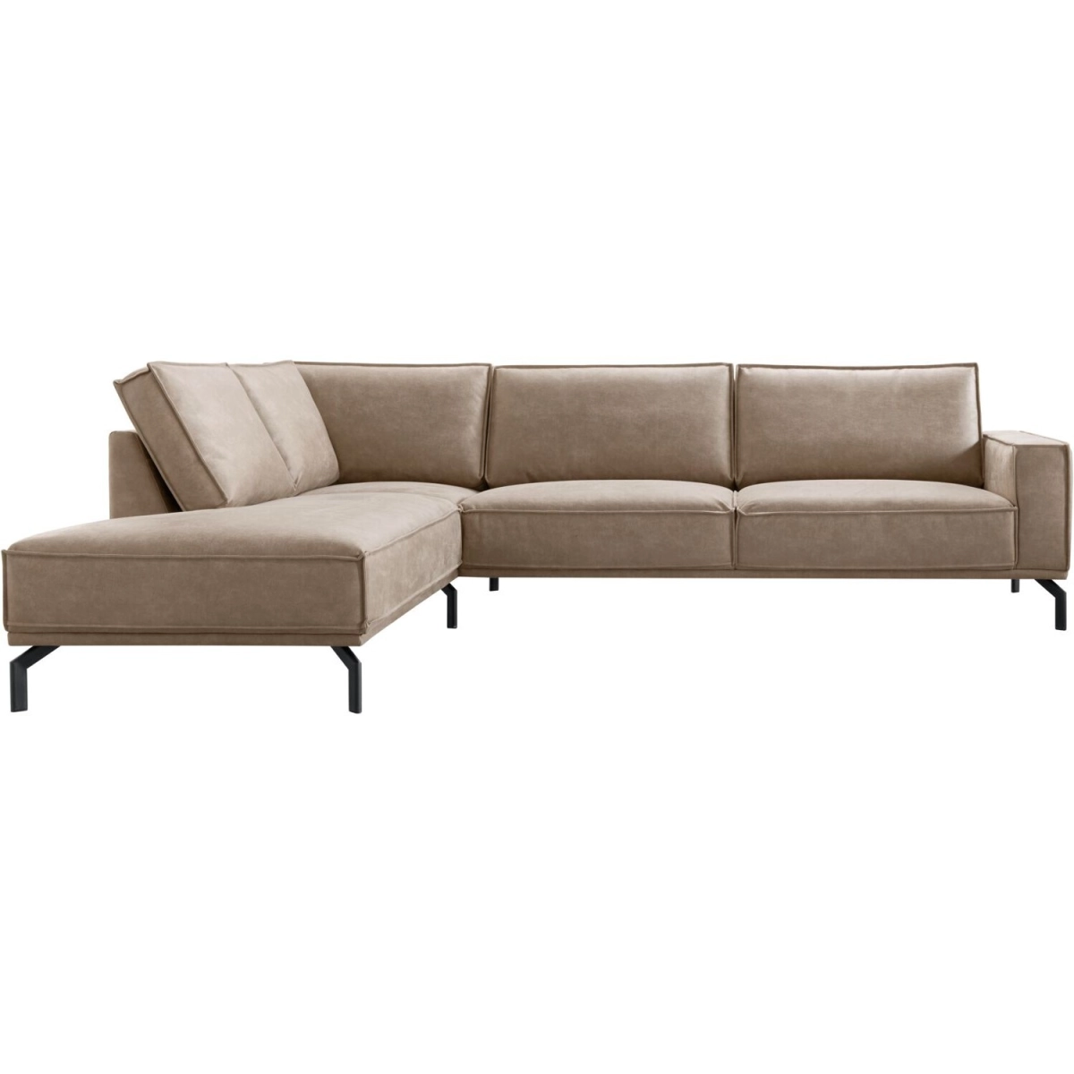 Hoek met eiland links + 3 zits arm rechts uitgevoerd in microleder bull 84-clay met HR-koudschuim in de zitting, mix van polyetherschuim- en siliconenvlokken in de rug en zwarte metalen poten (hoogte 17 cm).