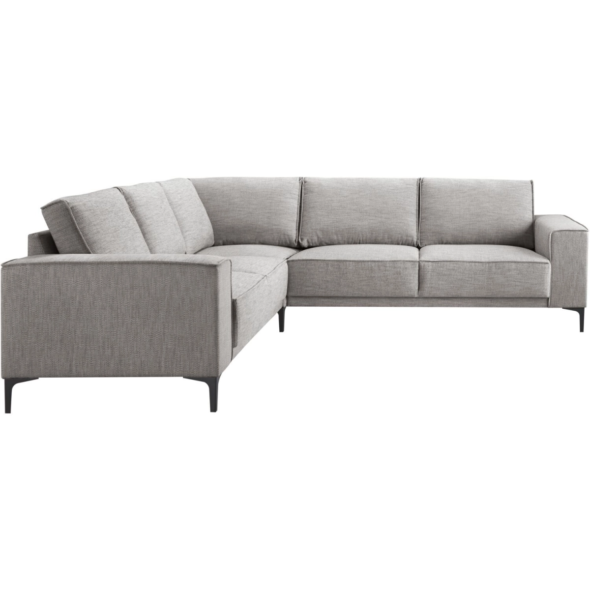 2 zits arm links + hoek + 2,5 zits arm rechts uitgevoerd in stof ramira 03-grey met brede armleuning, polyetherschuim in de zitting, mix van polyetherschuim- en siliconenvlokken in de rug en zwarte T-poten type 12234 H-150.