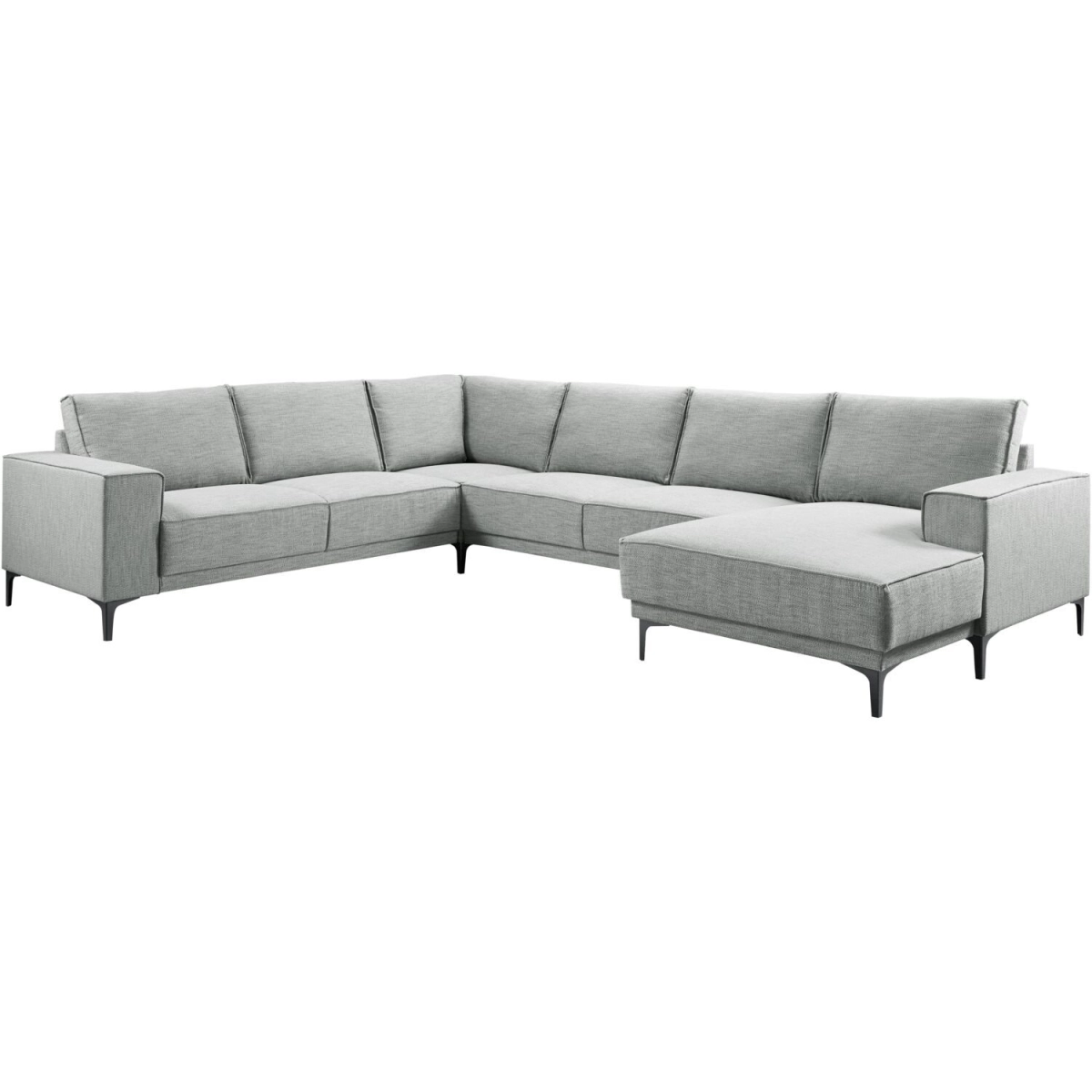 2,5 zits arm links + hoek + 2,5 zits zonder armen + chaise longue arm rechts in stof ramira 03-grey met brede armleuningen, HR-koudschuim in de zitting, mix van polyetherschuim- en siliconenvlokken in de rug en zwarte T-poten type 12234 H-150.