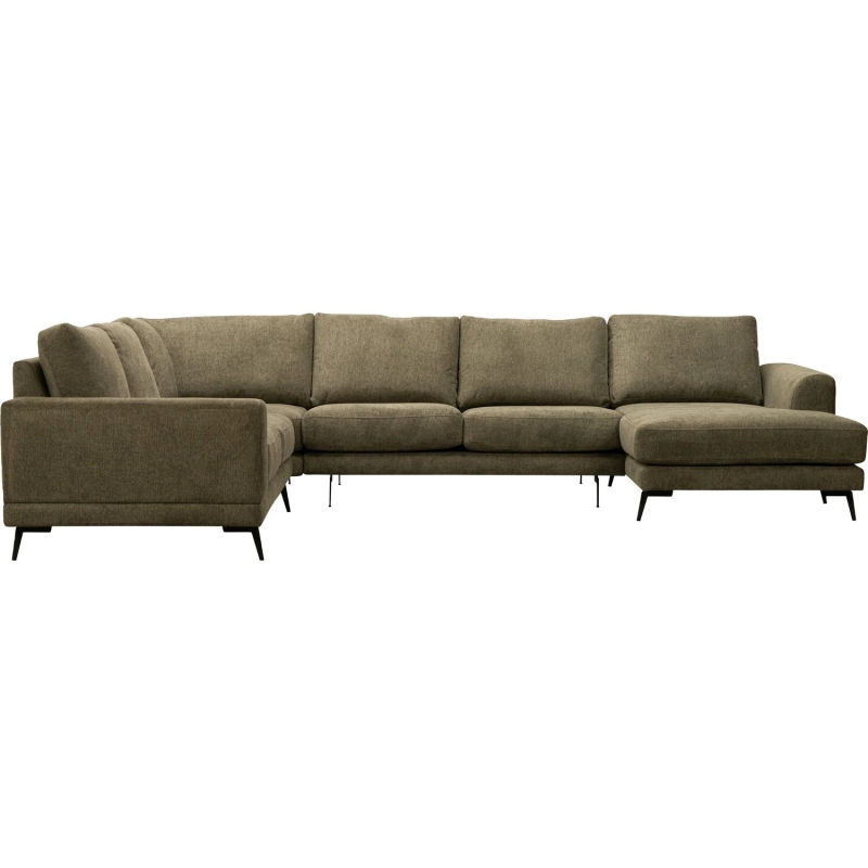 Donker groene hoekbank Flandria met chaise longue Losse zit- en rugkussens Bekleed met een gemêleerde weefstof met een zachte touch Hoogwaardig zitcomfort: pocketvering i.c.m. visco-schuim Moderne zwarte metalen poten Zelf samen te stellen Model Flandria heeft een eigentijdse uitstraling, hierdoor past deze in vrijwel ieder interieur. De bank is bekleed met een donker groen gemêleerde weefstof. Deze licht meerkleurige kwaliteit heeft een wat grovere structuur, maar wel een erg zachte touch. De zwart metalen poten maken deze moderne bank helemaal af.Het afwerkingsniveau en het comfort van deze royale hoekbank zijn van zeer hoge kwaliteit. In de zitkussens is namelijk pocketvering verwerkt. Dit zijn individueel verpakte veren, die los van elkaar reageren en bewegen, waardoor ze een goede ondersteuning bieden. Voor de toplaag is er gebruik gemaakt van visco-schuim. Visco-schuim is een traagschuim dat reageert op lichaamswarmte en zich naar de contouren van het lichaam vormt. Door deze combinatie ontstaat een zeer comfortabel, licht verend zitcomfort dat langdurig zijn vorm en optimale comfort behoudt. In de rugkussens is HR-schuim verwerkt met hierop een mix van dons en siliconen. Dit geeft een wat zachter comfort en een goede ondersteuning.Dit model is voorzien van losse kussens. Om de vorm en uitstraling van de kussens te behouden, adviseren wij je deze regelmatig op te kloppen en van plaats te wisselen voor een gelijkmatige belasting. De rugkussens zijn ook omkeerbaar. Door deze regelmatig om te draaien behouden deze nog langer hun vorm en comfort.Online is deze hoekbank ook gespiegeld, in een andere kleur en met een ander zitcomfort verkrijgbaar. Ben je helemaal weg van dit model, maar heb je liever een andere opstelling of een andere stof of kleur? Ook dat is uiteraard mogelijk.In de winkel is model Flandria verkrijgbaar in verschillende opstellingen en soorten bekleding. Ook zijn er diverse zit- en rugcomforts verkrijgbaar en kun je kiezen uit verschillende poten. Voor extra comfort zijn er verschillende afmetingen sierkussens en hoofdsteunen beschikbaar in dezelfde of bijpassende stof of kleur. Zo stel je jouw ideale bank Flandria helemaal zelf samen.