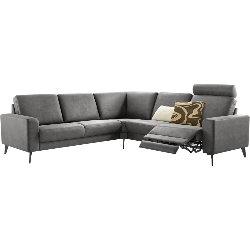 2,5 zits arm links + hoek klein afgeschuind + 1,5 zits (70) zonder armen + 1,5 zits (70) ar met relax en hoofdsteun, uitgevoerd in microleder bull 67-antraciet, met arm A, voorregel, hoge rug, HR-koudschuim in de zitting, HR-koudschuim in de rug en zwarte metalen poten (201K).