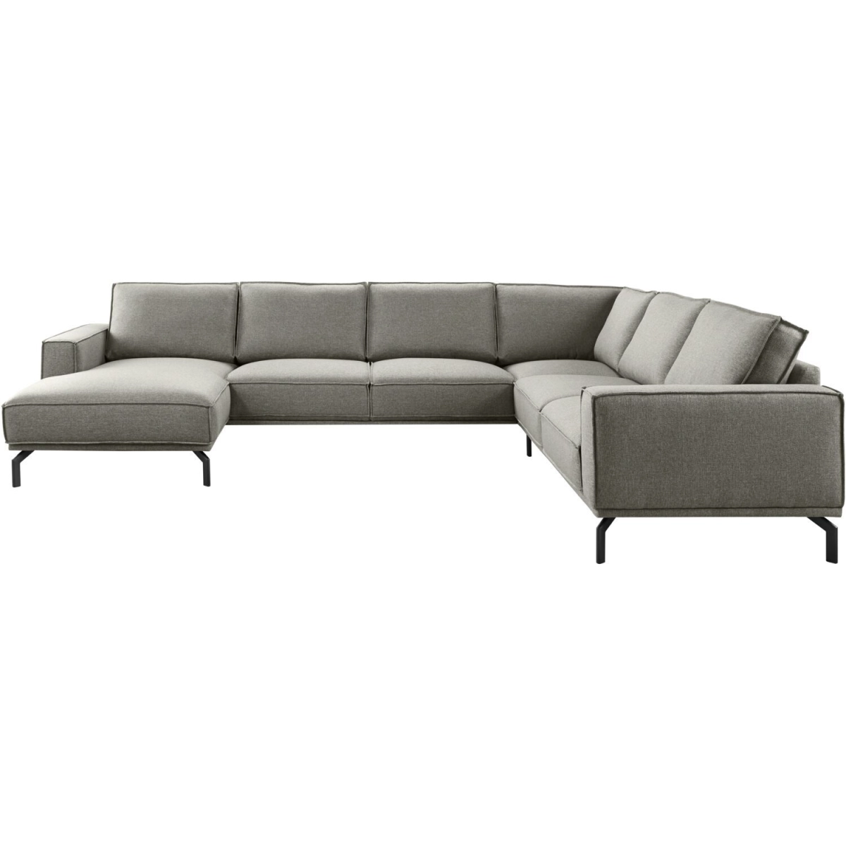 Longchair arm links + 2,5 zits zonder armen + hoek + 2,5 zits arm rechts, uitgevoerd in stof abba 13-khaki met polyetherschuim in de zitting, mix van polyetherschuim- en siliconenvlokken in de rug en zwart metalen poten hoogte 17 cm.