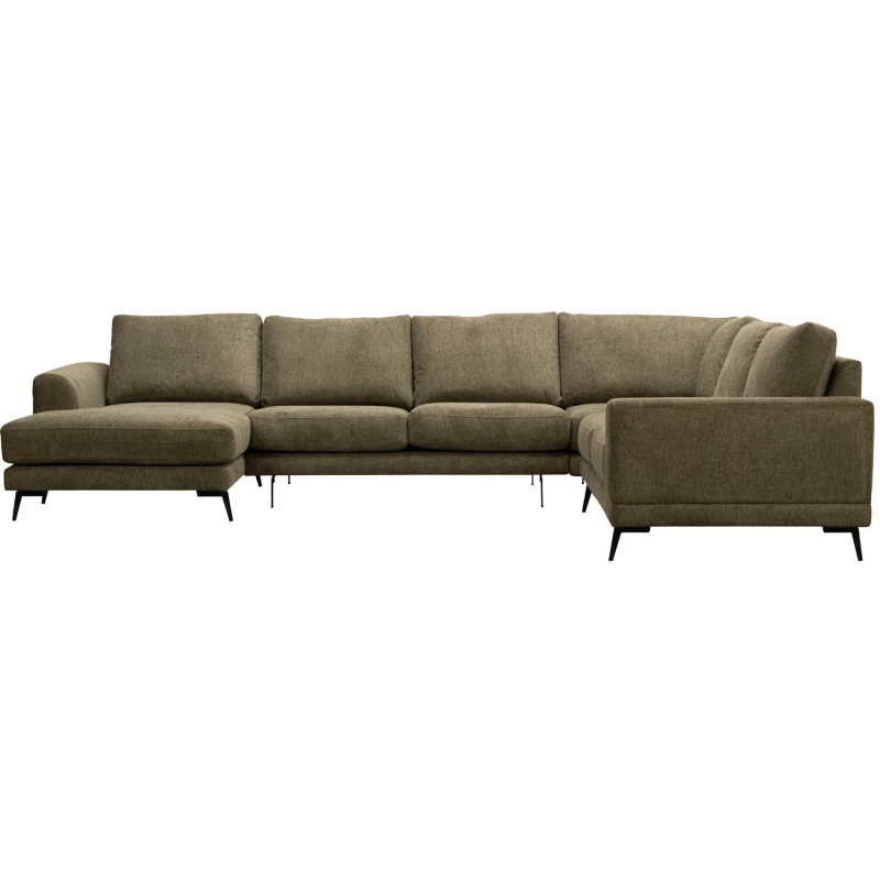 Donker groene hoekbank Flandria met chaise longue Losse zit- en rugkussens Bekleed met een gemêleerde weefstof met een zachte touch Hoogwaardig zitcomfort: pocketvering i.c.m. visco-schuim Moderne zwarte metalen poten Zelf samen te stellen Model Flandria heeft een eigentijdse uitstraling, hierdoor past deze in vrijwel ieder interieur. De bank is bekleed met een donker groen gemêleerde weefstof. Deze licht meerkleurige kwaliteit heeft een wat grovere structuur, maar wel een erg zachte touch. De zwart metalen poten maken deze moderne bank helemaal af.Het afwerkingsniveau en het comfort van deze royale hoekbank zijn van zeer hoge kwaliteit. In de zitkussens is namelijk pocketvering verwerkt. Dit zijn individueel verpakte veren, die los van elkaar reageren en bewegen, waardoor ze een goede ondersteuning bieden. Voor de toplaag is er gebruik gemaakt van visco-schuim. Visco-schuim is een traagschuim dat reageert op lichaamswarmte en zich naar de contouren van het lichaam vormt. Door deze combinatie ontstaat een zeer comfortabel, licht verend zitcomfort dat langdurig zijn vorm en optimale comfort behoudt. In de rugkussens is HR-schuim verwerkt met hierop een mix van dons en siliconen. Dit geeft een wat zachter comfort en een goede ondersteuning.Dit model is voorzien van losse kussens. Om de vorm en uitstraling van de kussens te behouden, adviseren wij je deze regelmatig op te kloppen en van plaats te wisselen voor een gelijkmatige belasting. De rugkussens zijn ook omkeerbaar. Door deze regelmatig om te draaien behouden deze nog langer hun vorm en comfort.Online is deze hoekbank ook gespiegeld, in een andere kleur en met een ander zitcomfort verkrijgbaar. Ben je helemaal weg van dit model, maar heb je liever een andere opstelling of een andere stof of kleur? Ook dat is uiteraard mogelijk.In de winkel is model Flandria verkrijgbaar in verschillende opstellingen en soorten bekleding. Ook zijn er diverse zit- en rugcomforts verkrijgbaar en kun je kiezen uit verschillende poten. Voor extra comfort zijn er verschillende afmetingen sierkussens en hoofdsteunen beschikbaar in dezelfde of bijpassende stof of kleur. Zo stel je jouw ideale bank Flandria helemaal zelf samen.
