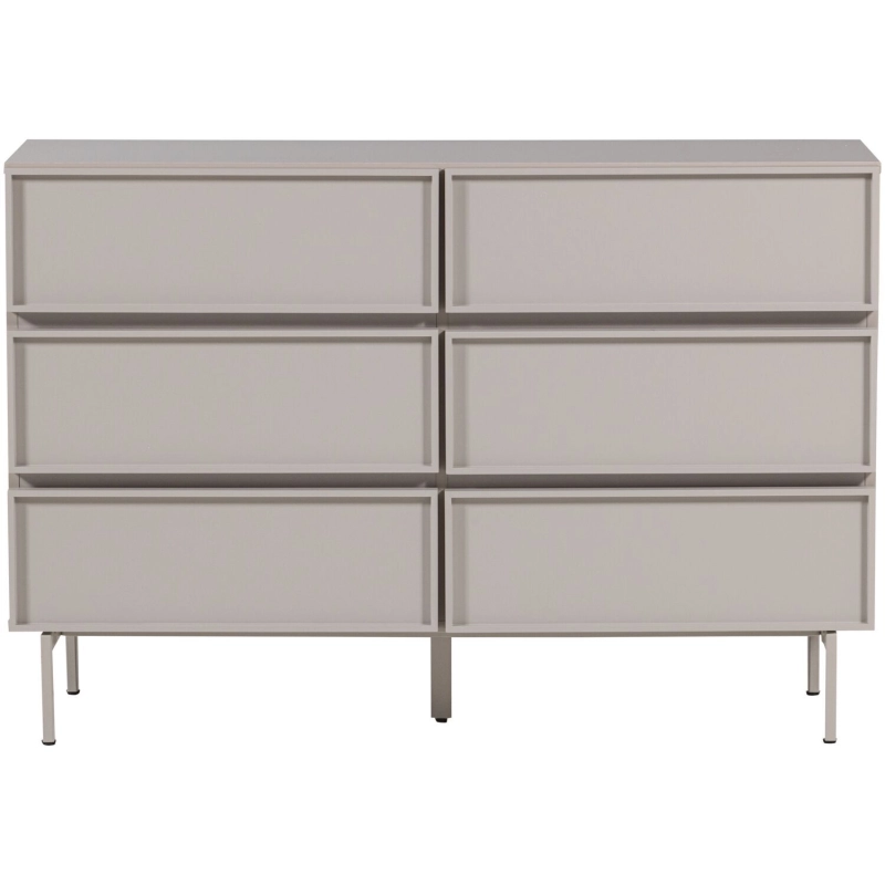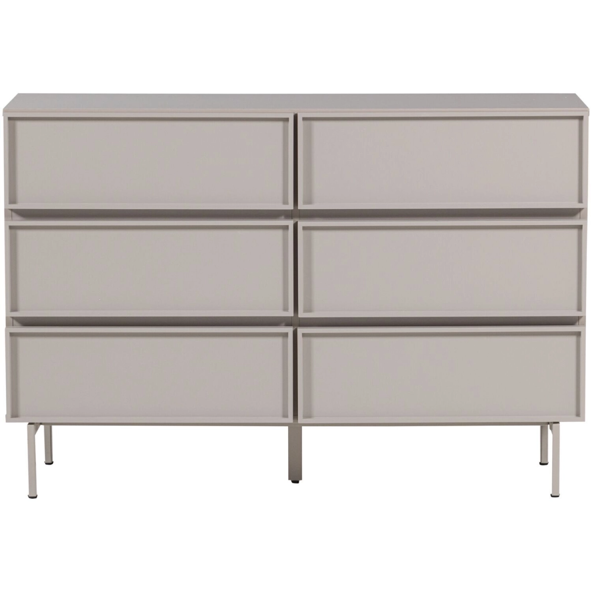 Uitgevoerd in melamine in de kleur sand met 6 laden en zandkleurige metalen poten.