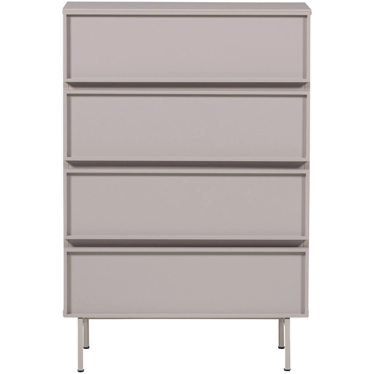 Uitgevoerd in melamine in de kleur sand met 4 laden en zandkleurige metalen poten.