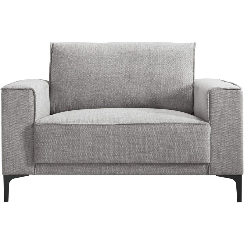 Uitgevoerd in stof ramira 03-grey met smalle armleuning, polyetherschuim in de zitting, mix van polyetherschuim- en siliconenvlokken in de rug en zwarte T-poten type 12234 H-150.