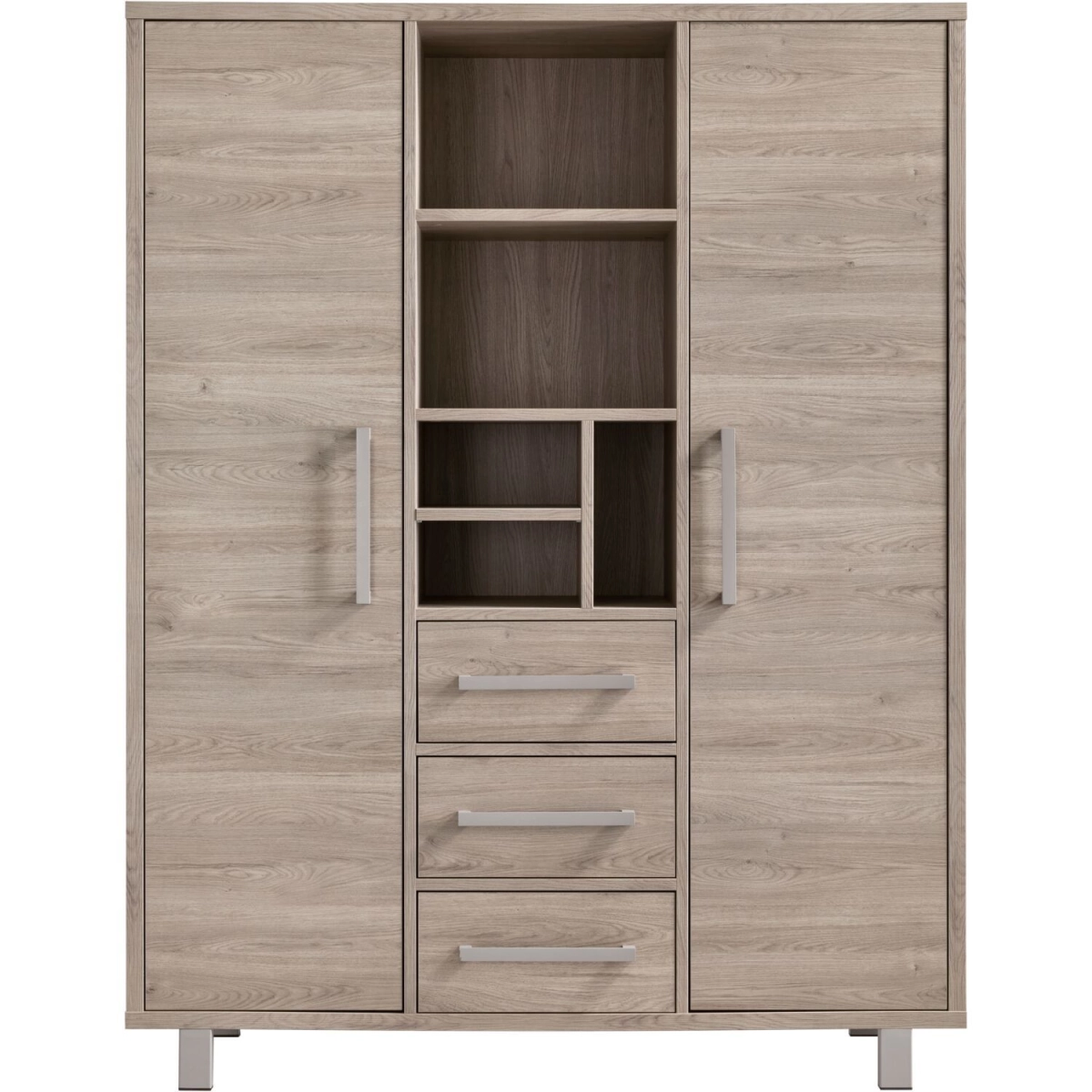 Uitgevoerd in de kleur grey oak met metalen handgrepen en poten in de kleur stone grey, met 2 deuren, 3 laden en 5 open vakken.