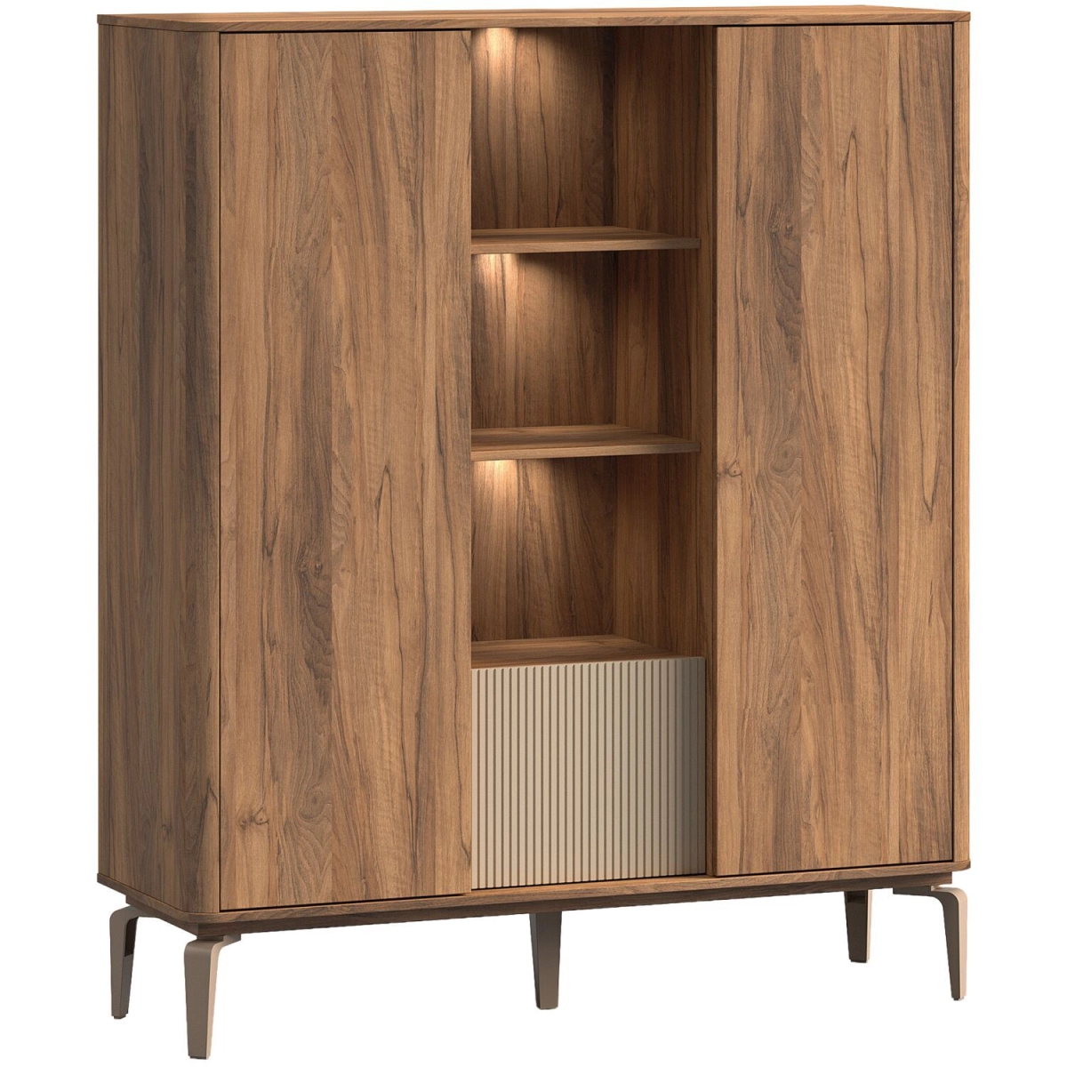 Moderne opbergkast Lodetto met chique champagnekleur Zeer kras-, slijt-, en stootvast met de uitstraling van echt hout Inclusief verlichting Onderdeel van een meubelserie 3 deuren en 3 open vakken Zelf te monteren Opbergkast Lodetto is een stijlvol meubel met veel opbergruimte. Het gebruik van hoogwaardig melamine in een warme bruine tint in combinatie met champagnekleurige details geeft dit meubelstuk niet alleen een chique uitstraling, maar verzekert ook duurzaamheid en onderhoudsgemak. Melamine heeft de uitstraling van echt hout, maar het is een zeer kras-, slijt-, en stootvast materiaal wat erg gebruiksvriendelijk en makkelijk te onderhouden is.De kast heeft een combinatie van 3 deuren en 3 open vakken, zodat er een ideale balans ontstaat tussen openheid en discretie. De 3 open vakken zorgen ervoor dat je de mogelijkheid hebt om decoratieve items te presenteren en jouw persoonlijke stijl te benadrukken. De open vakken zijn 32 tot 35,4 cm hoog en 43,5 cm breed.De kast is voorzien van LED verlichting voor een sfeervol effect. De LED verlichting is voorzien van een stekker en wordt bediend met een voetschakelaar. De kast wordt ongemonteerd geleverd, maar is met behulp van een montagehandleiding eenvoudig in elkaar te zetten.Combineer deze kast met andere meubelen uit de serie Lodetto voor een compleet interieur.OnderhoudsadviesHet onderhoud van dit meubel is heel eenvoudig. Voor het gewone onderhoud volstaat afnemen met een licht vochtige doek, droog het meubel daarna direct na met een schone en droge doek. Bij onvoldoende resultaat of hardnekkige vlekken kun je voor deze meubelserie de Multi Cleaner gebruiken.