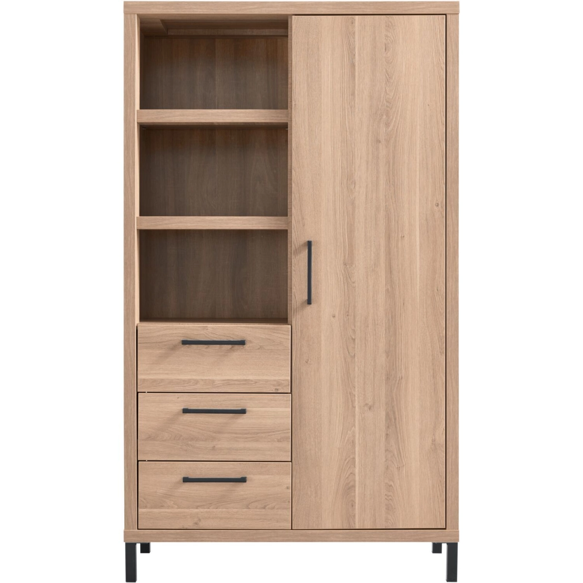 Uitgevoerd in melamine in de kleur brown cuneo oak met 1 deur, 3 laden en 3 open vakken en zwart metalen poten.