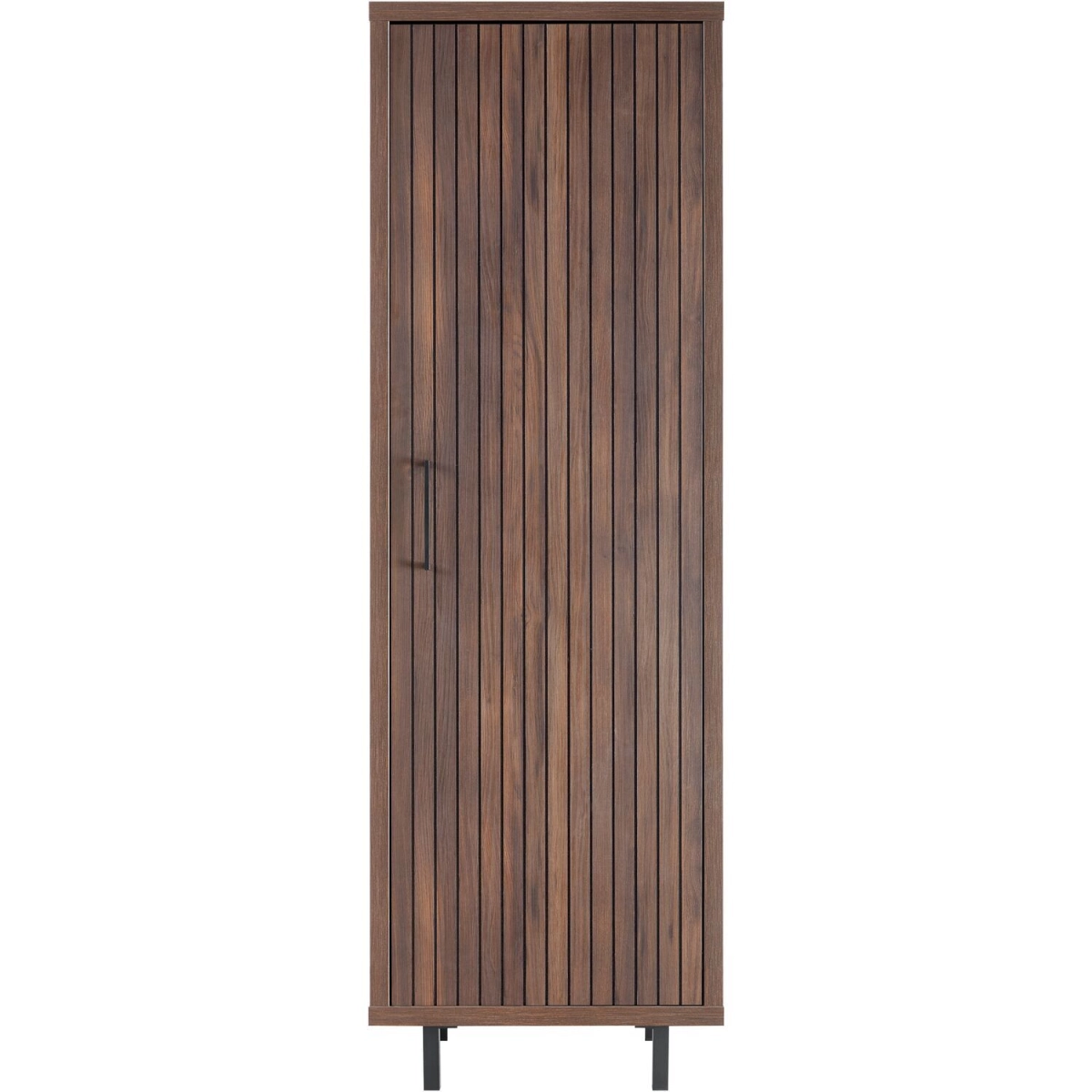 Smalle opbergkast Tenino Zeer kras-, slijt-, en stootvast Met softclose deur Onderdeel van een woonserie Zelf te monteren Ontdek onze uitgebreide woonserie Tenino. Het assortiment kasten, variërend van een vitrinekasten tot TV-meubels en praktische opbergkasten, biedt diverse mogelijkheden om een mooie leefruimte te creëren. De keuze voor melamine staat garant voor duurzaamheid en eenvoudig onderhoud. Melamine heeft de uitstraling van echt hout, maar het is een zeer kras-, slijt-, en stootvast materiaal wat erg gebruiksvriendelijk en makkelijk te onderhouden is. De donkerbruine kleur en latjes op de kasten geven de woonserie een retro gevoel. Dit gecombineerd met het metalen onderstel vormt een mooi contrast tussen retro en modern.Optimaliseer jouw ruimte met de smalle opbergkast, compleet met softclose technologie voor een geruisloze sluiting. De doordachte indeling omvat een 4 handige legplanken achter de deur. Dit maakt deze opbergkast niet alleen stijlvol, maar ook functioneel.Het meubel wordt ongemonteerd geleverd, maar is met behulp van een montagehandleiding eenvoudig in elkaar te zetten.De kast is perfect te combineren met andere meubelen uit de serie Tenino en de eettafels uit de serie Caltana.OnderhoudsadviesHet onderhoud van dit meubel is heel eenvoudig. Voor het gewone onderhoud volstaat afnemen met een licht vochtige doek, droog het meubel daarna direct na met een schone en droge doek. Bij onvoldoende resultaat of hardnekkige vlekken kun je voor deze meubelserie de Multi Cleaner gebruiken.