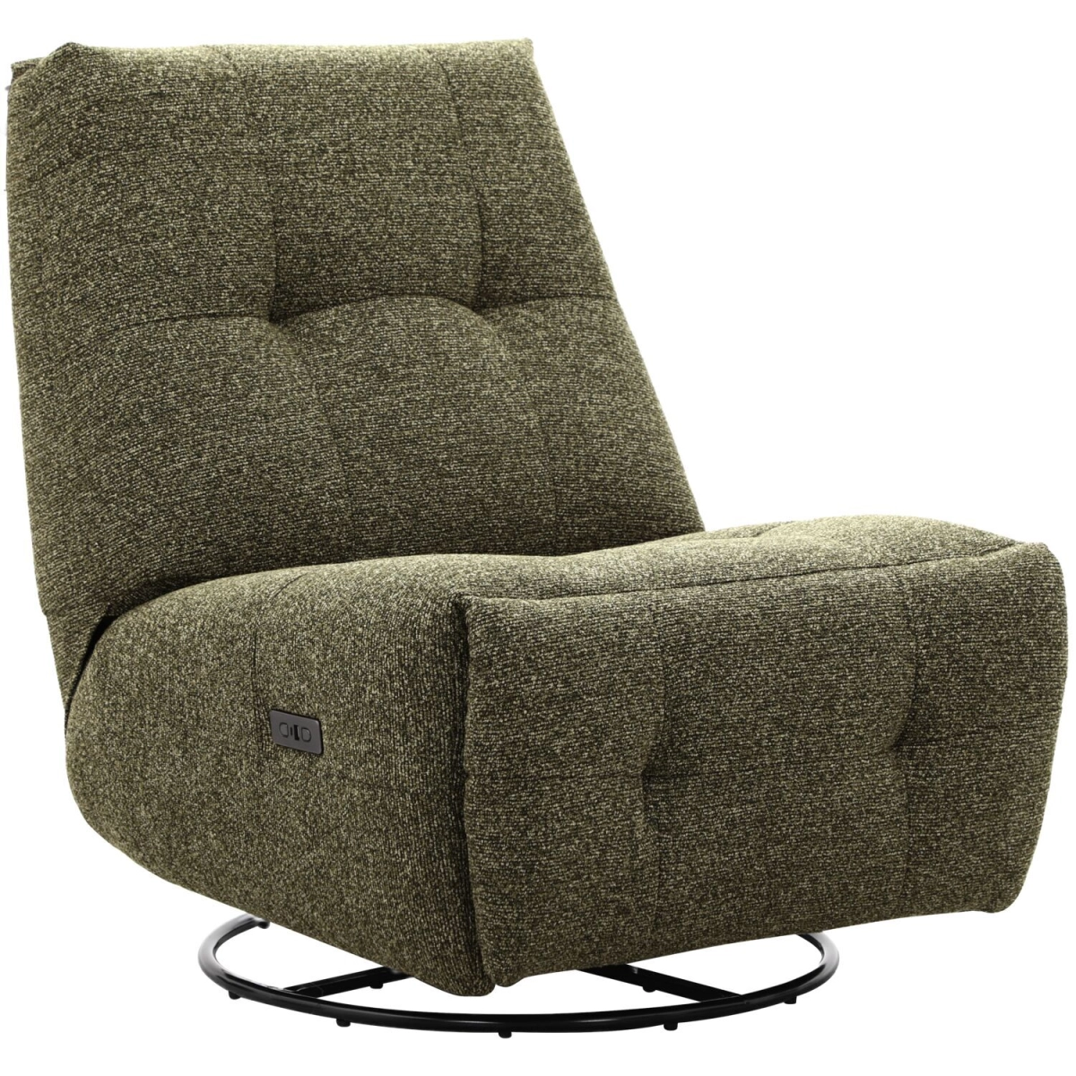 Elektrisch verstelbaar, uitgevoerd in stof majestic weave forest met zwart metalen ronde draaivoet.