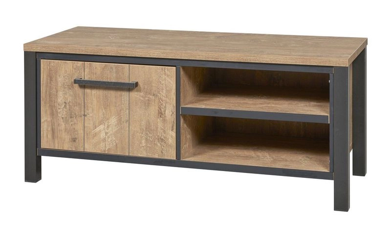 Industrieel tv-meubel 126cm breed met metalen frame Stoere industriële uitstraling door het metalen frame Populaire keuze voor een tv-meubel van maximaal 130cm breed 1 deur en 2 open vakken Kras-, slijt- en stootvast Uitstraling van echt hout met een licht reliëf Zelf te monteren Onderdeel van meubelserie Mendiga Dit tv-meubel Mendiga is een stoer industrieel tv-meubel met een metalen frame en een kras- slijt- en stootvaste melamine afwerking. Dankzij het slanke zwart metalen frame heeft tv-meubel Mendiga een stoere maar toch strakke look. Het tv-meubel heeft 1 deur en 2 open vakken. Achter het deurtjes vind je 1 legplank en achterin het open vak is een gat voor de kabeldoorvoer. Dit tv-meubel is dus zowel ideaal om een redelijk grote tv op kwijt te kunnen, als om spullen in op te bergen. Het tv-meubel is goed te combineren met de andere meubelen uit de serie Mendiga. Onderhoudsadvies Het meubel bij voorkeur 1x per maand intensief reinigen met Multi Cleaner. Voor dagelijks onderhoud kun je het meubel eenvoudig afnemen met een lichtvochtige doek, nadien wel droogwrijven. Vlekken altijd direct verwijderen met een vochtige doek. Bij onvoldoende resultaat of hardnekkige vlekken de Multi Cleaner gebruiken.